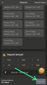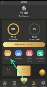 Tap on the wallet option provided in the menu. Here, you will see an option for deposit and withdrawal.